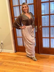 This skirt is comically long. I am usually determined to make a piece work no matter what but even with pulling this dress over my boobs it was still touching the ground. The color was also not what I expected in person and a strange material. Big time fail, do not rent unless you are 7 ft tall!!