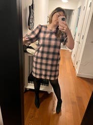 I wore this to a girls dinner and it was super comfortable pregnant. Just size up a couple sizes for a better fit, depending on which trimester you’re in. It has pockets! I paired it with some boots and got a lot compliments.