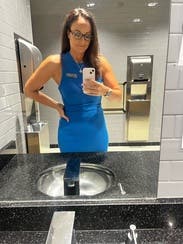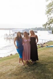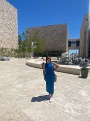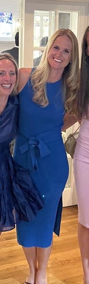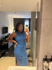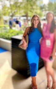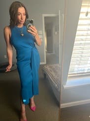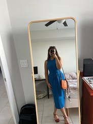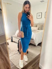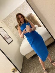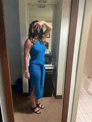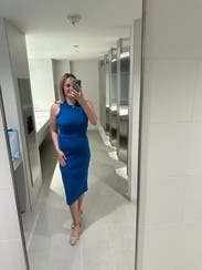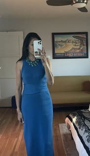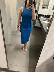 Super flattering and great medium blue. The side slit is flattering also but not too much. Wore for a work photo shoot- great for brand photography. Would rent again.