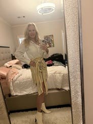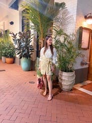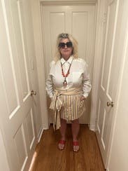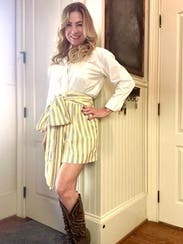 The Toccin x RTR Solid & Striped Bow Shirt Dress showcases a crisp silhouette with a sculptural striped wrap skirt. Style it with slim-block heels and a crossbody bag, and gold hoop earrings for a smart-casual rooftop lunch.