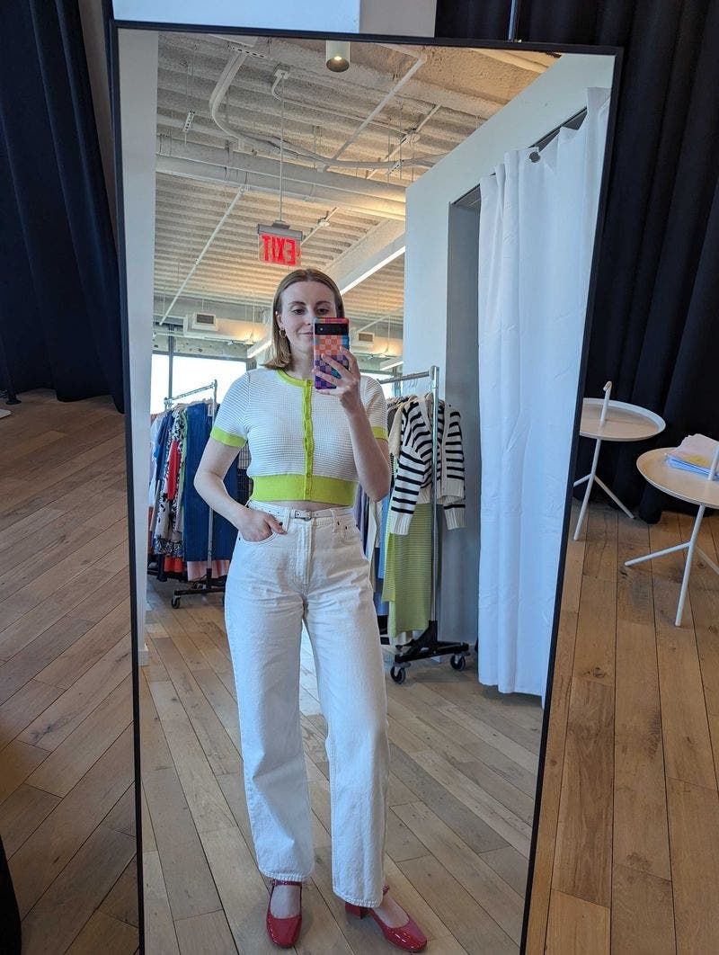 This TOCCIN X RTR cropped cardigan embodies a playful yet sophisticated charm with its bright lime accents and textured knit fabric. Pair it with high-waisted trousers or a sleek pencil skirt for a chic, modern look.