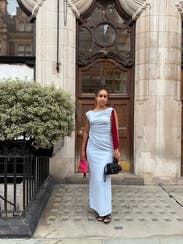I felt like Charlie’s Angels Lucy Liu circa 2000 in this dress. The two-piece silhouette, asymmetrical neckline and blue/merlot color combo made it incredibly unique and elevated, yet still effortlessly cool. An added bonus is how versatile the adjustable ties make the dress - you can either tighten them for the two-piece cut-out look, or loosen them to wear the dress fully closed. 12/10.