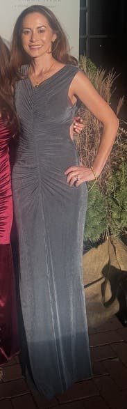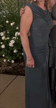Great dress for black tie gala. Soft, stretchy material with ruching that helps with midsection even after dinner and drinks. Comfortable for dancing. Dress caught on my 3” heels occasionally, but long length meant beautiful draping