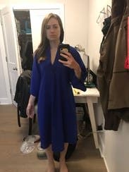 The color and feel of this fabric are wonderful. I definitely recommend belting and I sized down 1 size because I'm 6 months pregnant but I could have gone down even another! Wore a camisole under it for work but may try it without for date night! Also disregard my annoyed face in the picture... it always happens when my husband is taking pictures.