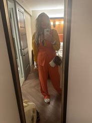 I absolutely adored this top and would have purchased it if it was in my budget. The goldenrod color is vibrant and rich. The fit was great, even as someone with itty bitties and zero cleavage. Wore with high waisted jeans. Best to wear in spaces where you won’t be lifting your arms, definitely showed off my entire stomach and bra otherwise.