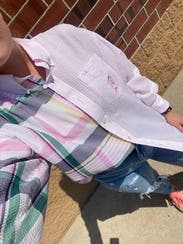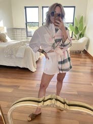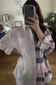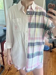 Great oversized shirt, definitely on the "coastal grandmother" trend. Note that the shirt is seersucker. In the model photos the solid side looks plain white but it's actually pink seersucker. It runs super oversized so you can size down if that's all that's available.