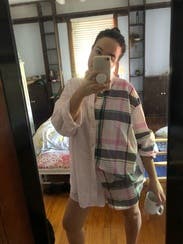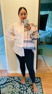 i'm 35 weeks pregnant and am living in this oversize button up. I love the searsuckered material and the oversize fit. If I wasn't pregnant would have sized down to an XS.