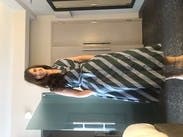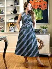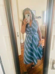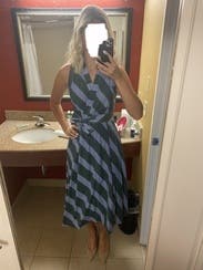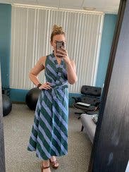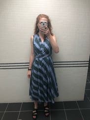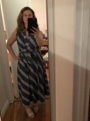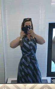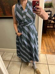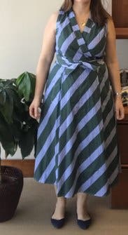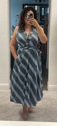 Wore this dress for a work trip on the train from NYC to Boston and loved it. It was super comfortable and looked great all day, all while allowing me to move effortlessly - getting in and out of taxi cabs, up and down stairs, managing suitcases, sitting for hours, etc. Felt classy and polished the whole time. As for fit, it’s a super easy style to wear. The wrap cut and the diagonal stripes make it slimming and flattering. It has cute pockets and the length was a perfect midi-length on my 5’2” frame. I needed no pins or tape to wear it. The material surprised me - it’s light but has a cotton blend to it, so a little less flowy than I expected. It also needed a good ironing before wearing it. Would definitely recommend.