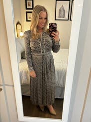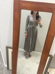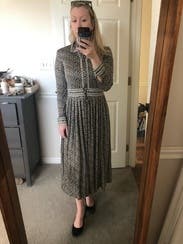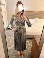 This is a great work dress—very polished and put together. The pleats give it a nice structure, and the fabric feels high-quality: heavy but slinky, with a subtle gold sheen woven into the pattern that catches the light just enough. It’s definitely on the conservative side, but still flattering. The drawstring bow at the waist adds shape, and I could see this being flattering on pretty much any body type. A solid wardrobe staple.