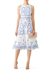 White and blue embroidered cotton (100% Cotton). Sleeveless. Crew neckline. Hourglass bodice. Hidden back zipper and side-seam pockets. Fully lined. 47" long. Imported.