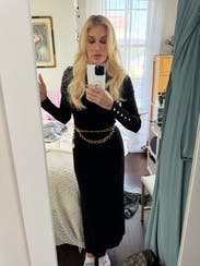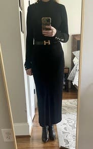 Wore it multiple ways with different accessories. Very comfortable dress, looked great with heeled boots and a draped sweater, dolled up for a Madonna concert, and also with a holiday sweatshirt and Jordans. Wasn’t too long as a shorty. Really liked that the neckline could be adjusted based on the buttons you buttoned.