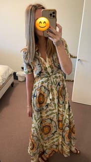Love this dress! I wore it both to a tea party and to the office. It lends itself to just about any event depending on how you style it. It runs very big but it has a drawcord at the waist so you could adjust to any size, you’ll just have a bit more ruched fabric, but it looks great this way too. I had to wear with a slight heel to prevent it from dragging on the floor. I absolutely loved this dress. Will rent again!