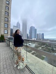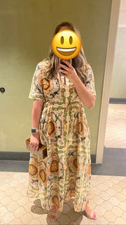 This dress is to die for. People who weren’t even with our group approached me to compliment it! I’m usually a size 12 in dresses but typically a 14 in Tory Burch. The XL fit me comfortably — didn’t have to safety-pin between buttons as I usually do due to my large bust, and was able to cinch the waist with the drawstring. The dress is lined but still a light, flowy material. It was perfect for Fall on the CA coast