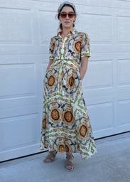 The carousel pattern on this dress is so fun. It's is also a light fabric that flows nice. The sleeves and buttons on the chest were a little snug on me but overall enjoyed this dress for a outdoor/indoor country club wedding.