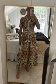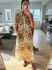 If I had a spare $500, I would have bought this and found an excuse to wear it once a week. The colors are the most amazing palette. Fit tip: The top portion fit just right, I’m a 34B, and this dress would not have buttoned if I had a larger cup size.