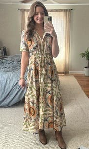 This dress and beautiful and springlike (but also great for warm fall days) - I loved the print and colors, and also that it only buttoned from waist to neck. The fit wasn’t ideal for me though. The waist sits a bit too high and while there is a drawstring tie belt to adjust the fit, it was a little unflattering because it looked like it was at the waist but it was really around my ribs.