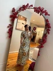 This dress was an absolute hit for a work event - it was comfortable, has pockets, and I got a bunch of compliments. It’s much more beige and much less green in person, and there are cute animals as part of the print, which was fun.