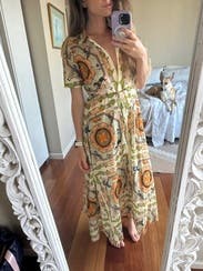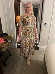 This dress is amazing! The print is gorgeous and the silhouette is flattering. It’s easy to dress up or down. There’s an extra layer of lining, giving it a more structured feel. I wish I could purchase it! Will be renting again!