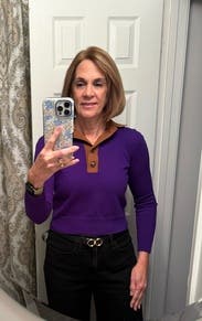 The purple, the v neck, the brown collar, my goodness this top is so unique and versatile