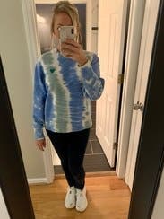 I rented this at the beginning of quarantine and LOVED wearing it while working from home. This sweatshirt is so bright and on trend with the tie dye. Great with leggings or biker shorts. I was sad to send it back!! Really nice quality as well. Ordered an XS and felt like it was a little oversized.
