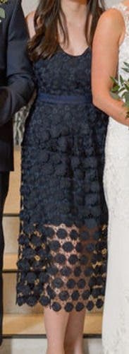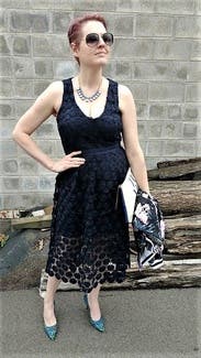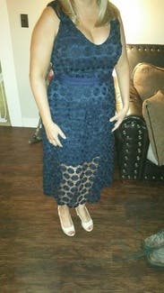 Wore this for a family wedding this spring. I went with the size 10 to be comfortable, as I'm still trimming down after having my baby last year. The 8 did fit, but was too tight. The neckline can be a bit revealing for a bustier lady, but it was still appropriate for the event. I loved the overlay, as it gave this navy frock some visual interest and allowed me to stand out from the crowd without being obnoxious. A very hard balance to strike when one wants to look their best, but not be too flashy. I paired this dress with a floral bomber, pumps, a clutch. BUT, I can see this working with a lot of other pieces, it's a very versatile number. I also featured this on my blog: www.outfitsnotjustclothes.blogspot.com