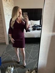 Feminine form-fitting dress, breathable fabric; pretty sleeves; could have been worn for a date night or from work to dinner. Wore it to work; wish I’d snapped a pic! Very pretty Fall burgundy/wine color