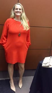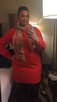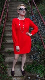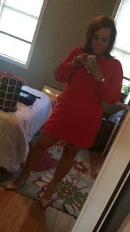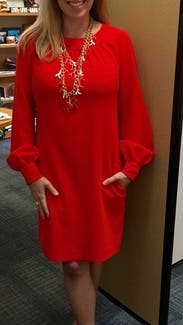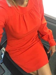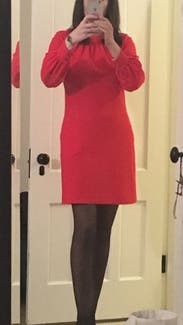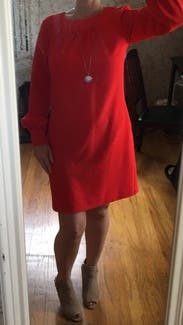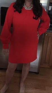 Wore this to my husband's holiday party. Loved the long sleeves, pockets and stretchy material. Was perfect with black tights. Also the color is a bit more red than it looks online, which I liked! Good dress to hide your imperfections, especially if you're planning on eating and drinking throughout the evening!