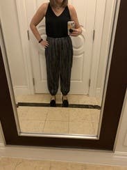 I have a harder time with separates than I do with dresses so I order what the suggested size is. These pants are HUGE on me. My 19 year old daughter could probably hop into them with me. That being said, they are super cute; a nice juxtaposition of dressy and casual. I am going to wear them to dinner when my husband and I head up to the mountains for vacation. I really need a crop top or something tight like a tank top to contrast the volume of the pants though.