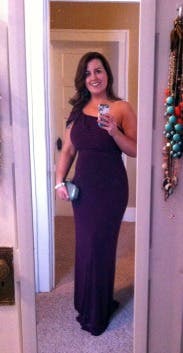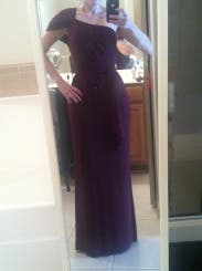This was my first RTR rental, and the experience couldn't have been better. After reading the reviews, I ordered my usual size 10 and a size 8. I'm so glad I did. The 8 fit, and was even a bit stretched out in the bust for me - and I am a 32 G bra size! Normally it's very hard for me to find dresses with enough fabric in the bust area, so I end up getting larger sizes to accommodate my chest. Instead, this dress accommodated and complimented all my curves. The fabric is a nice, heavy jersey. To me the model photo made the dress look like a deep cranberry, but the dress is really a deep plum. I paired the dress with a RTR clutch, RTR emerald earrings, and a RTR pave bracelet. At a hospital benefit filled with many beautiful gowns, I received more than my share of compliments and was happy to be one of the few wearing a color other than black. My other main motivators to love the dress were that it perfectly covers my shoulder tattoo and that it was so comfortable. I even was able to wear my usual bra with just a strap tucked down. I did get the regular length and with five inch heals it perfectly skimmed the floor, so it is a bit long but I am only 5'2".