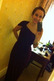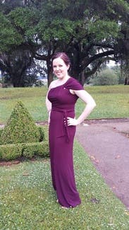 I really loved this dress. The jersey material was comfortable and surprisingly forgiving, and the color was a nice departure from basic black. Despite the jersey material, the dress was more than formal enough for a black tie wedding. I got a ton of compliments, and I felt comfortable yet elegant. The length could not have been more perfect for me - I am 5'3"(5'2" and 3/4 if you want to get technical) and I wore 4 inch heels - the dress hit the floor, but just barely. If you're taller and/or wear taller shoes, you'll definitely want to get the long. As for the fit - both the 8 and 10 fit very well. The dress is true to size. The 8 was just a little smaller across my stomach, so I went with the 10 so that I'd be comfortable even after eating/drinking all night. I used fashion tape to ensure that the shoulder stayed in place - I would recommend doing this, because I could see that the shoulder might otherwise slip down. The top did get a little loose as the night went on, but it was still great. I was a bit worried that the jersey would highlight problem areas, but it actually worked perfectly. The belt helped highlight my curves. Another great rental - I think this dress would work well on most everyone.