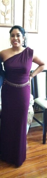 I changed the shoulder part a bit and added some sparkle to break up the purple. It hung perfectly and I received so many compliments that night! I paired this with wedges although you couldn't really see them (dress was a bit long).