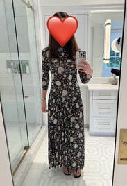 I did not want to send this rental back! It was sooo comfortable while being really flattering and beautiful. It is definitely a body con fit to the hips, with free, loose hip to ankle. Do not rent if you are self-conscious about your bust/stomach, unless you wear something over it! It is very thin silk jersey. That being said, the fabric was busy and the pattern was forgiving. TTS for Ulla Johnson, which runs big for me. XS was perfect. I dressed it up with heels and fur for cocktails at a friend’s home, and dressed it down with boots and a hat for daytime. Comfortable, easy, will absolutely rent again.
