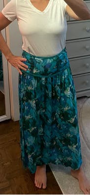 Lovely flowy soft fabric. Very comfortable. Colors are beautiful. I'm going to remt thethe next size down if I'm lucky enough to get theis skirt again.