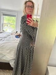 A guy described this dress as “it’s giving NYC’s take on cottagecore for fall” and I think that’s the perfect description. I received so many compliments on this dress! It’s nice and lightweight so perfect to wear on a warmer fall day by itself or to pair with a jacket. While the ruching hides tummy concerns from the front it’s not exactly flattering from the side so spanx are definitely helpful.