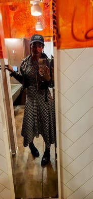 The gingham is perfection with laced knee combat boots, I paired with a dad hat and the leather SLATE & WILLOW CROPPED MOTO JACKET. I wore it a bit differently to work but didn't take any pics of that styling. These are a blur but I hope you get the gist. @lizziloui
