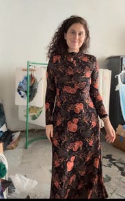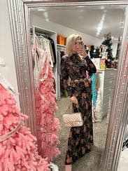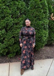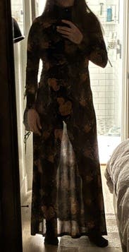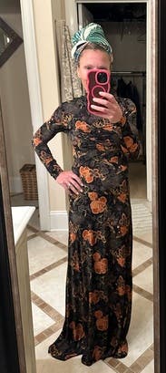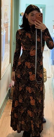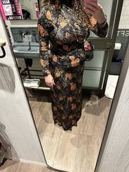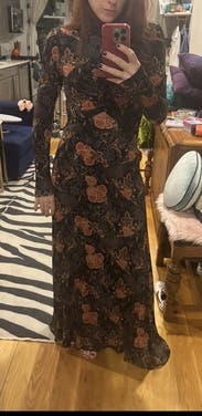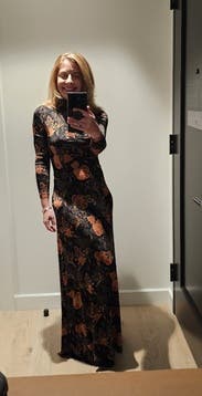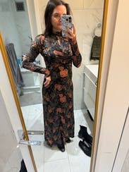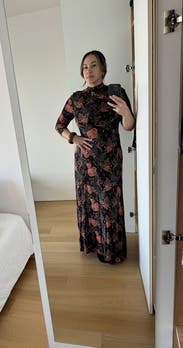 Absolutely obsessed with this floral maxi! The fit is sleek but comfortable, and the print gives just the right amount of romantic drama. Body hugging and thin, soft fabric. Perfect for dinner, cocktails, or anywhere you want to turn heads without even trying. Pairs beautifully with a sparkly bag and simple heels!