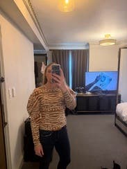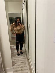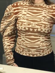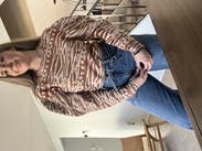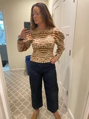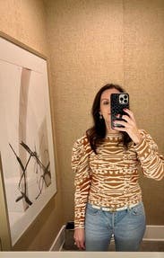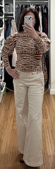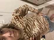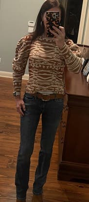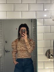 I enjoyed this sweater; it has a cool animal-like print with 2 tones of brown to match whatever boots/coat you want to wear. The puff sleeves are substantial, but make it interesting. Only issue is that it is close to a crop cut, so I was pulling it down frequently - but then again I have a long torso so should be fine for most sizes. The coat is also RTR (loved it)!