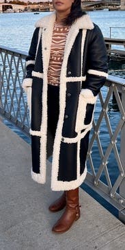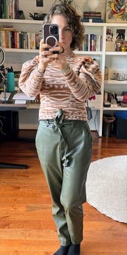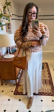 This top is so much fun! And it’s warm. The material is stiff yet soft so it holds its shape. Loved the pattern as well. I paired it with faux leather pants by Peter Som Collective, also from RTR.