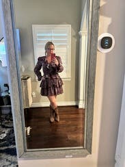 Ambassador review! Was hesitant with all the bad reviews but based off how “big” the dress seemed on everyone, I sized down two sizes from my usual size 6 and the fit was perfect! I found it to be flattering and not too much fabric at all. Love the print for fall! Follow MGMstyles on Instagram for more rental reviews