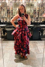 Wow, I was banking on this dress working and it absolutely delivered. It's such a unique print and a really fun shape for the dance floor. The material would be a little too casual if this dress had any other silhouette — instead that just made it really comfortable for a long day at a wedding. Petite gals, this is a great wedding guest dress for us! Also, because of the neckline and back, you can wear a bra (I did to give myself a little more shape) but also might not *need* to, so that's a win. Warning: the ruffles make it rather bulky for packing.