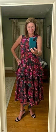 Loved this dress. It’s cotton (ish), - not your typical formal dress fabric but it was so cool (literally & figuratively) for a June wedding. It fit perfectly. I loved the form fitting top half with the full skirt. I felt glamorous and comfortable. I had to iron the “ruffles” but so worth it. If it wasn’t so memorable, I’d have bought it.