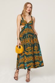 Waist cutouts lead to an open tie back in this adorable sweetheart neck midi dress by Ulla Johnson.