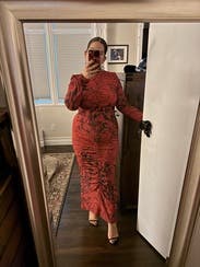 Wore this for a valentines dinner at our favorite steakhouse. Great fit, I’m 5’6” and this hit me mid calf. Beautiful fit
