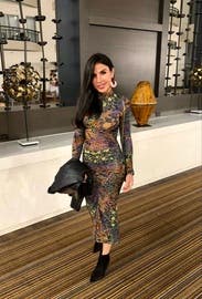 Loved wearing this brilliantly and fabulously colored, graphic, and most unbelievably comfortable and chic tailored and fitted dress-the most perfect for day-night! Loved the stretch of the fabric, long sleeves, and flattering neck line-made the gorgeous graphic and its colors pop even more! Found TTS, petite friendly, and beautiful photographed sitting in my wheelchair to plan the Connective Strength Fashion Show at coffee. ☕️ Couldn’t find a more perfect chic dress to advertise our fashion show while looking professional and ready to make an unforgettable night celebrating Disabled Glamour & fundraising! 💚🫶🏼🦓 A MUST-Rent United in Motion dress! So easy to layer with tights, boots, cardigan, jackets for fall and winter looks!