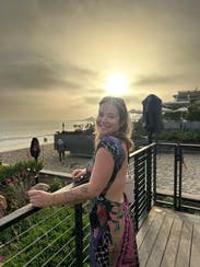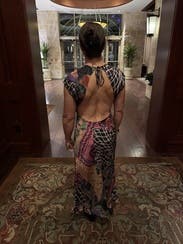 One of my favorites. The fabric is silky and feels so good. The print is chic and lively. So many compliments! The open back is stunning. Wore some boob tape and walah!