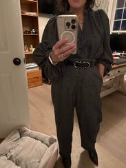 I love the set! Very warm and comfortable, while being extremely flattering and fashionable. The set was one of my favorite rentals. The waist is nipped, flowing to tailored hips and loose legs. Fit was perfect for me; I might rent one size up for comfort next time.