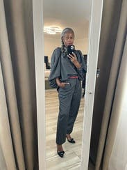 The pants look cuter without a long blazer.the waist is very fitted. I got tons of compliments when I worn this. I regret I didn’t buy it.