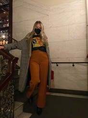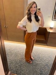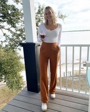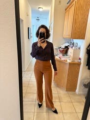 I’ve been looking for pants like this on Rent the Runway for a while and these were perfect. I wore them to work, for Christmas Day and to my works holiday party. The waist size was perfect and was pretty high waisted. The flare was also perfect. And great burnt orange color!!!
