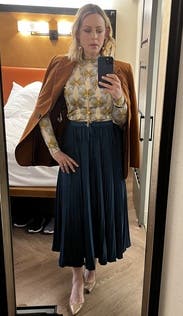 Totally stole the look off the model for this one!! This blazer is a GORGEOUS color, fits true to size (and is comfortable in the arms!!), and is versatile for so many looks. Wore this for my birthday and definitely turned heads. So many compliments! I'm so in love I just might buy it. Absolutely a must must must rent.