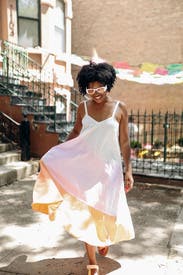If you don't mind talking to strangers, this is a good dress. Faces literally brightened when I walked in a room. One person said the dress looked like happiness, another said summer, you get the picture. It's a little sheer but almost doesn't matter bc it's so billowy (your panty line is far away). It's also extremely comfortable in hot weather - you almost feed nude bc it's so airy.